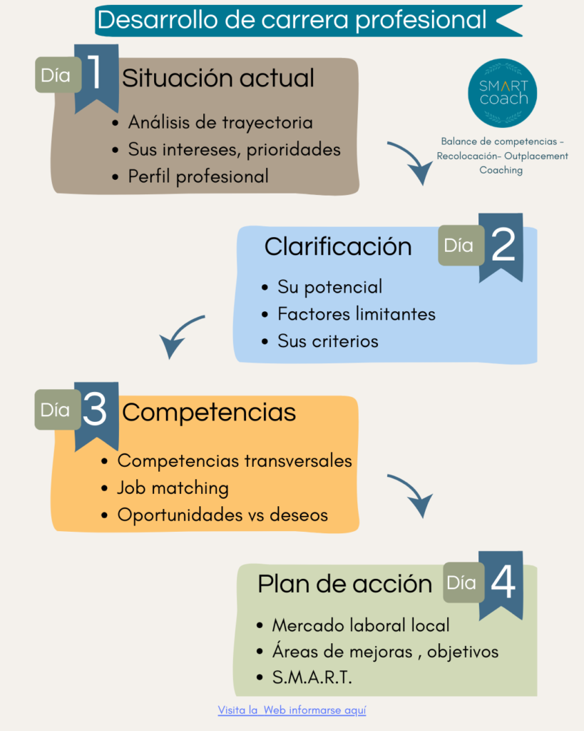 My Smart Coach vous accompagne sur le Parcours clarté et décision sur 2 semaines, ou en bilan de compétences, en 8 séances individuelles, ainsi qu’en coaching individuel.